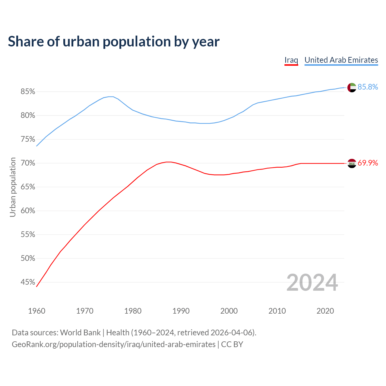 From 2004 to 2024, the share of urban population changed from 68.2% to 69.9% in Iraq and from 81.5% to 85.8% in the United Arab Emirates.