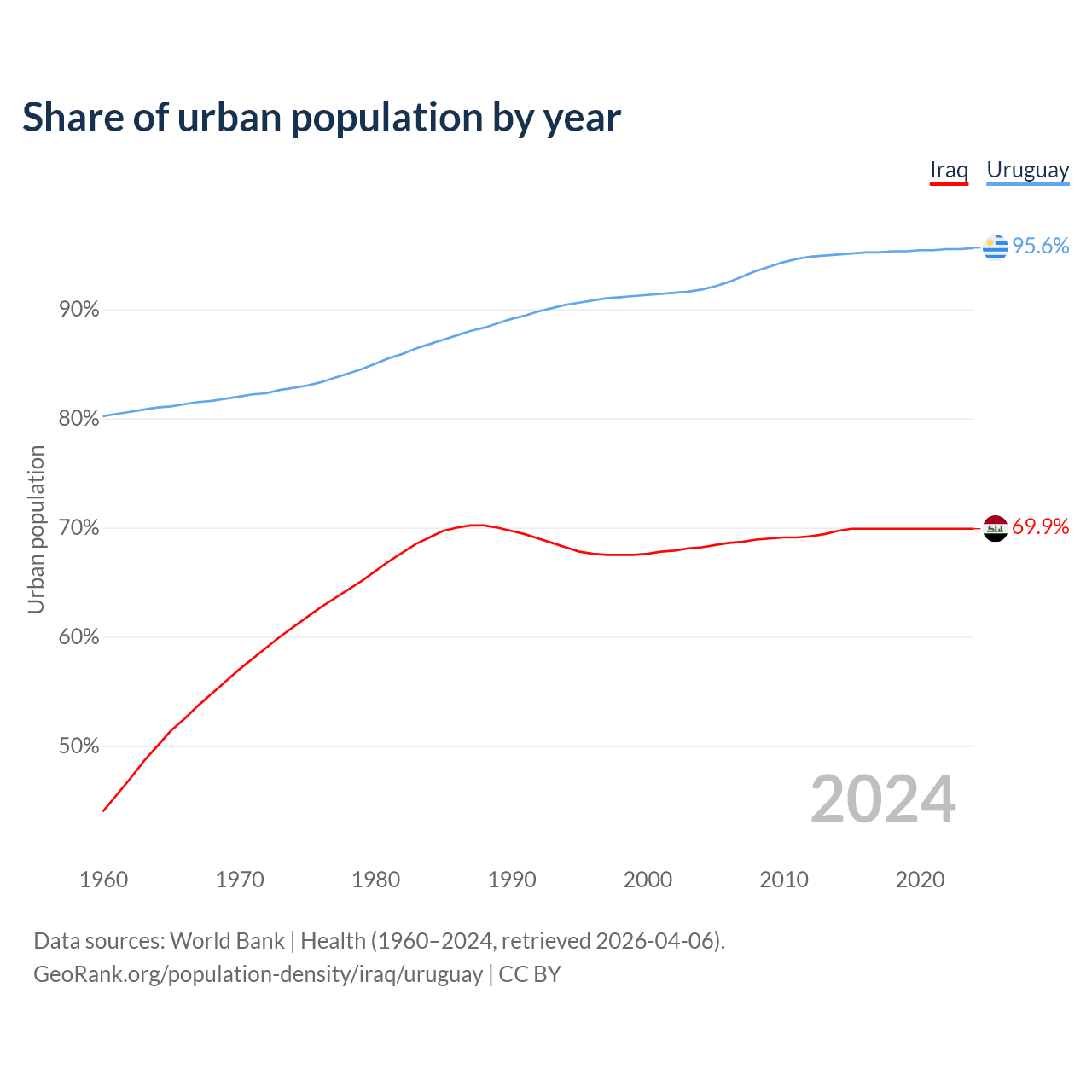 From 2004 to 2024, the share of urban population changed from 68.2% to 69.9% in Iraq and from 91.8% to 95.6% in Uruguay.