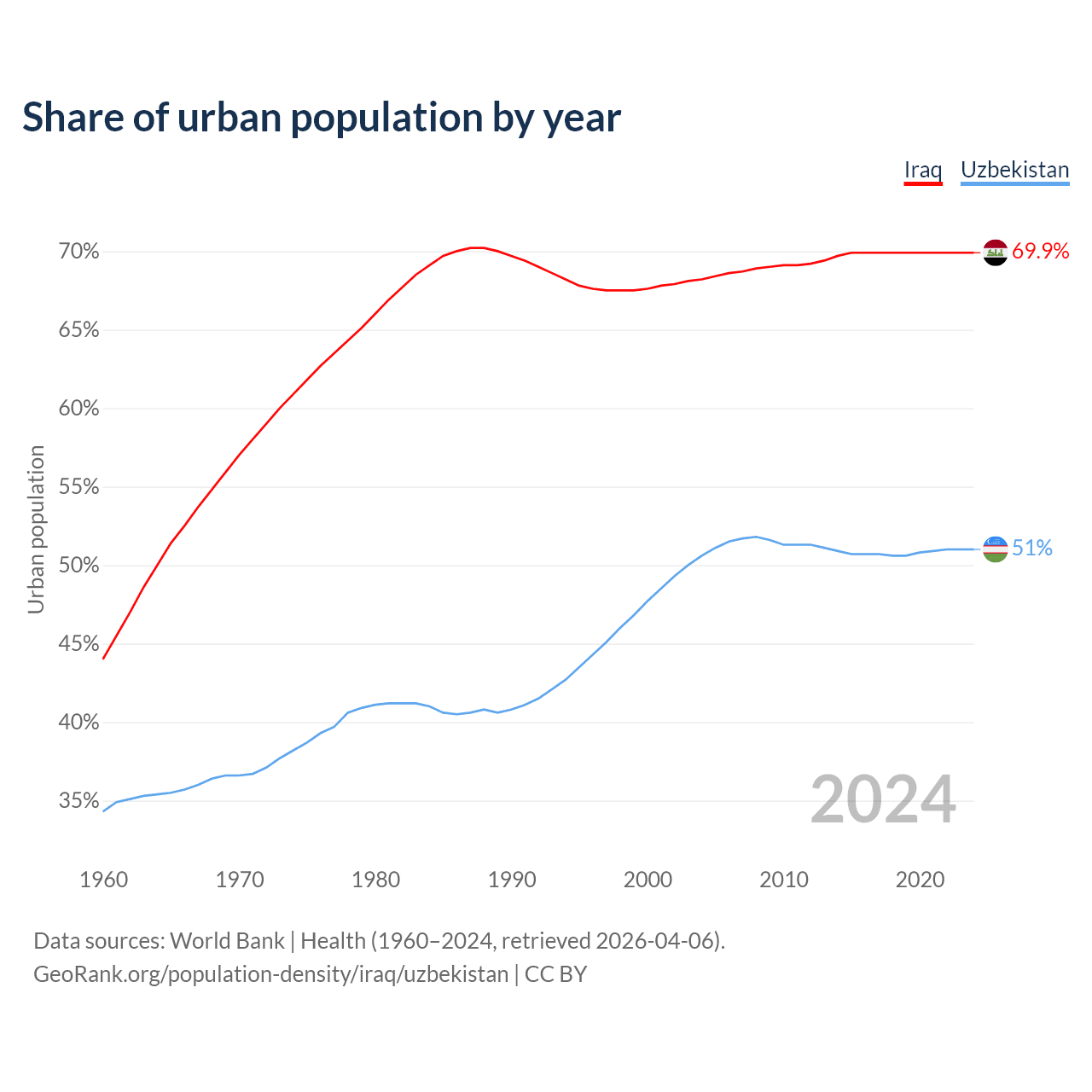 From 2004 to 2024, the share of urban population changed from 68.2% to 69.9% in Iraq and from 50.6% to 51% in Uzbekistan.