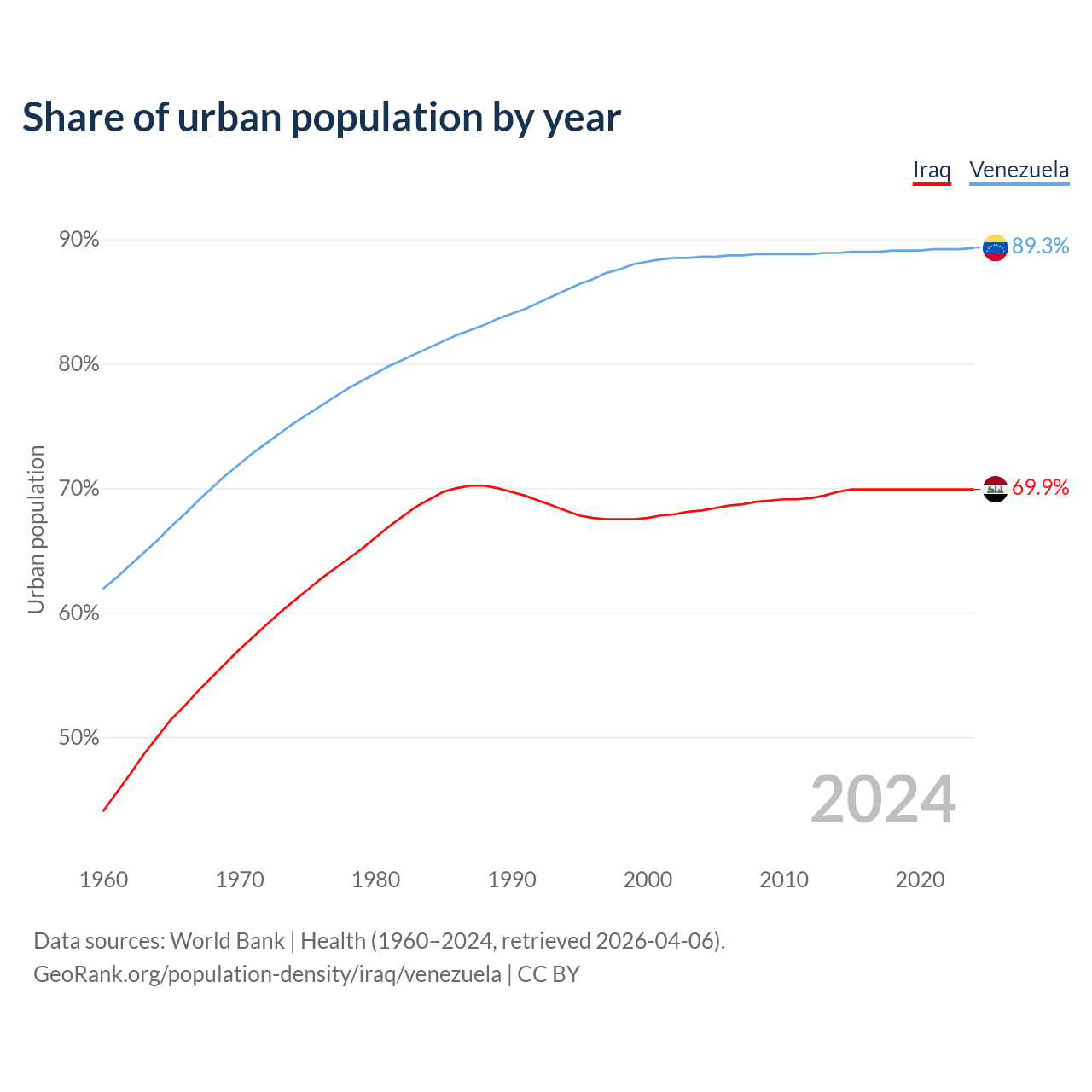 From 2004 to 2024, the share of urban population changed from 68.2% to 69.9% in Iraq and from 88.6% to 89.3% in Venezuela.