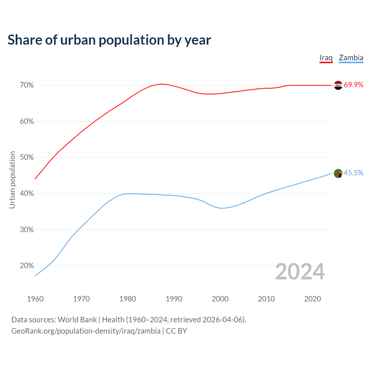 From 2004 to 2024, the share of urban population changed from 68.2% to 69.9% in Iraq and from 36.8% to 45.5% in Zambia.