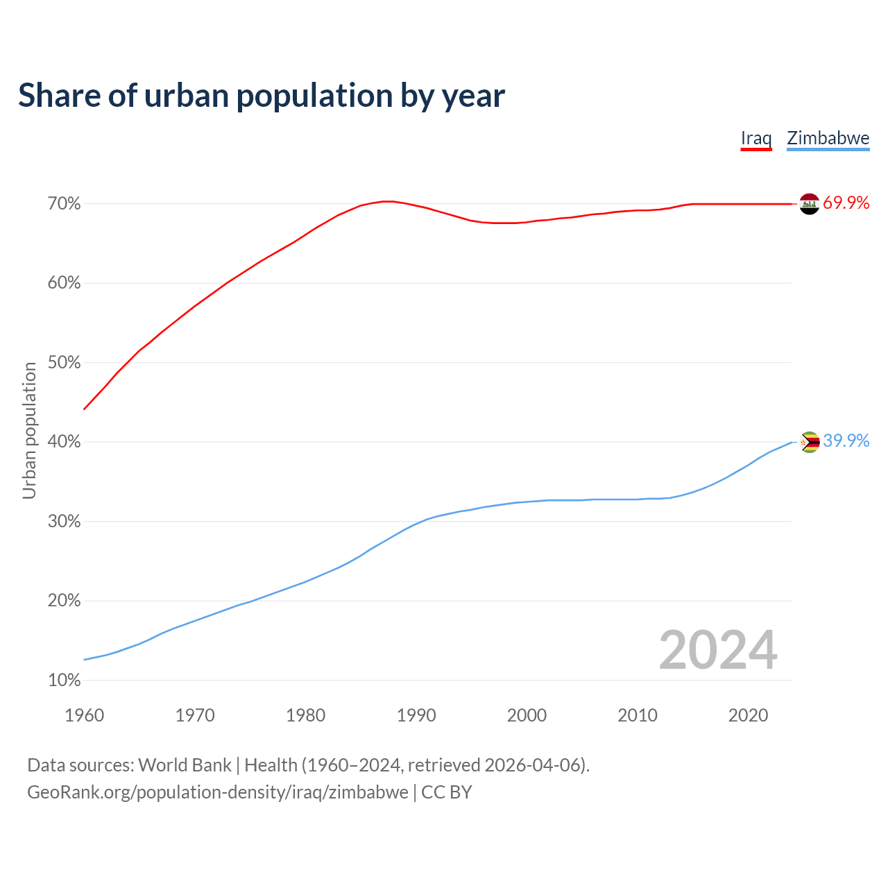 From 2004 to 2024, the share of urban population changed from 68.2% to 69.9% in Iraq and from 32.6% to 39.9% in Zimbabwe.
