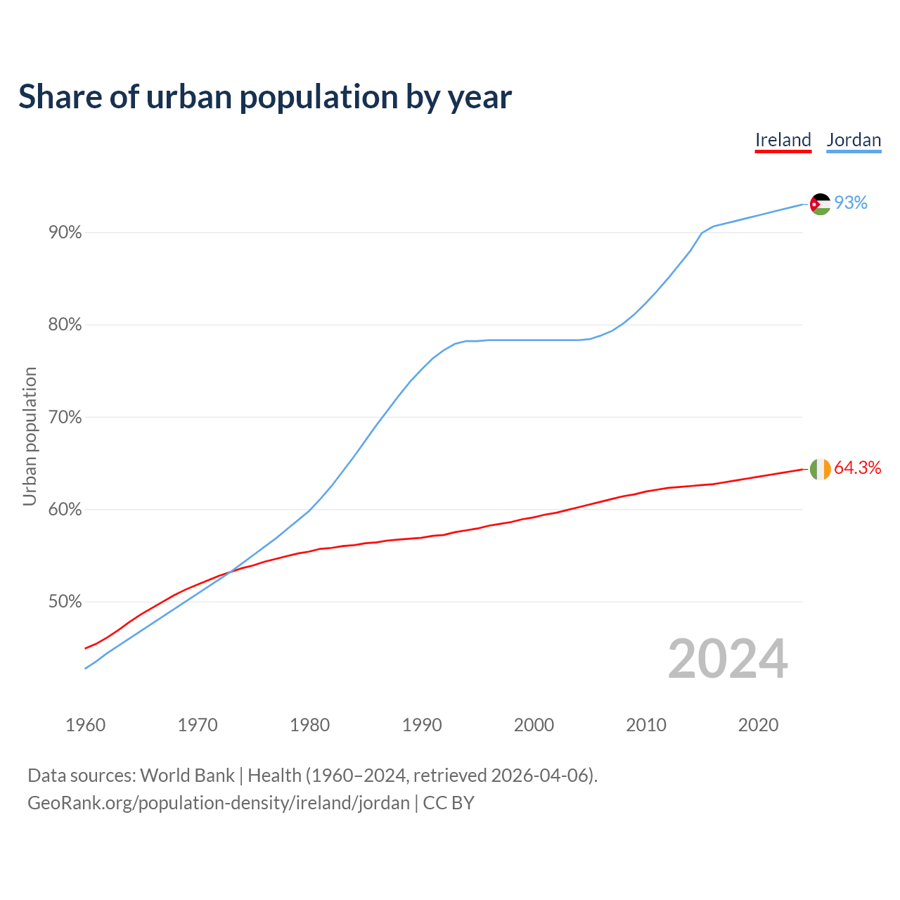 From 2004 to 2024, the share of urban population changed from 60.2% to 64.3% in Ireland and from 78.3% to 93% in Jordan.