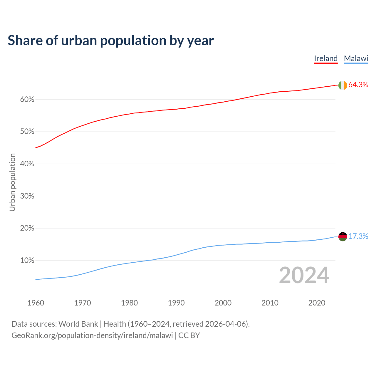 From 2004 to 2024, the share of urban population changed from 60.2% to 64.3% in Ireland and from 15% to 17.3% in Malawi.