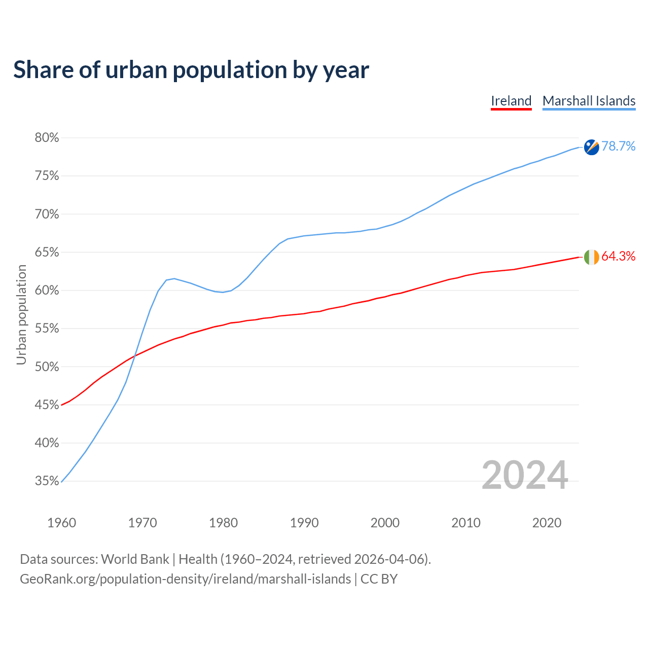 From 2004 to 2024, the share of urban population changed from 60.2% to 64.3% in Ireland and from 70.1% to 78.7% in the Marshall Islands.