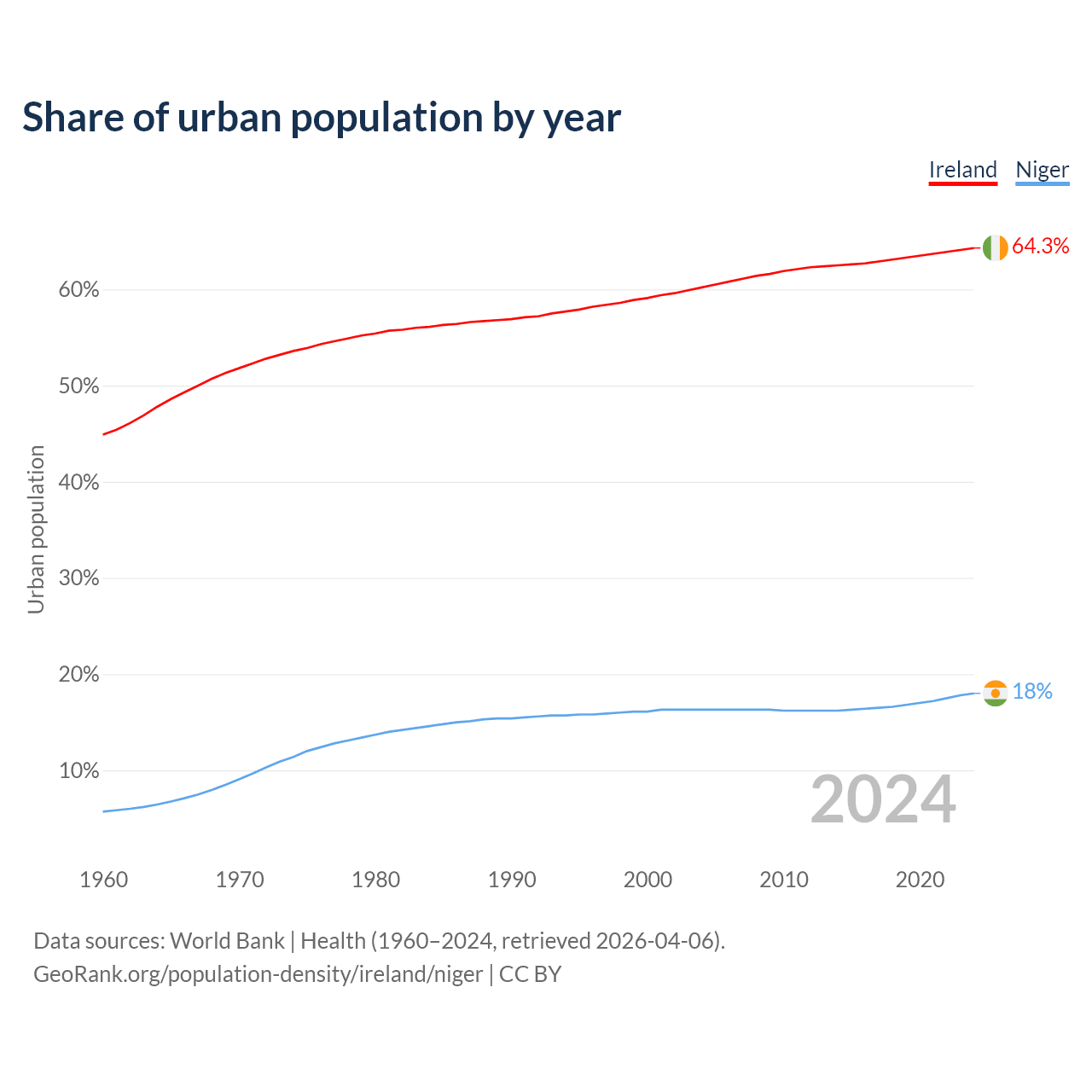 From 2004 to 2024, the share of urban population changed from 60.2% to 64.3% in Ireland and from 16.3% to 18% in Niger.