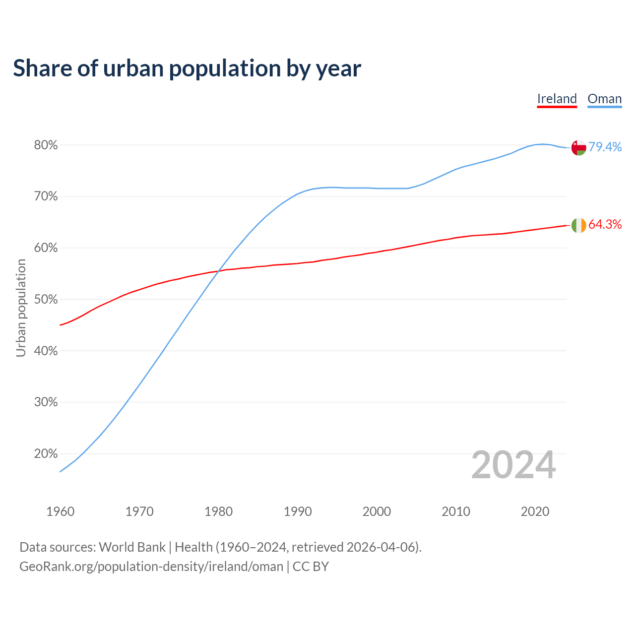 From 2004 to 2024, the share of urban population changed from 60.2% to 64.3% in Ireland and from 71.5% to 79.4% in Oman.