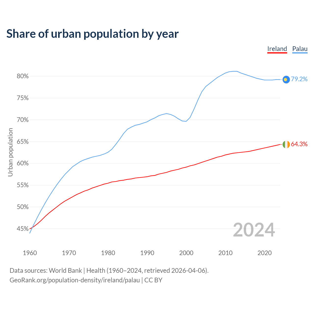 From 2004 to 2024, the share of urban population changed from 60.2% to 64.3% in Ireland and from 76.4% to 79.2% in Palau.