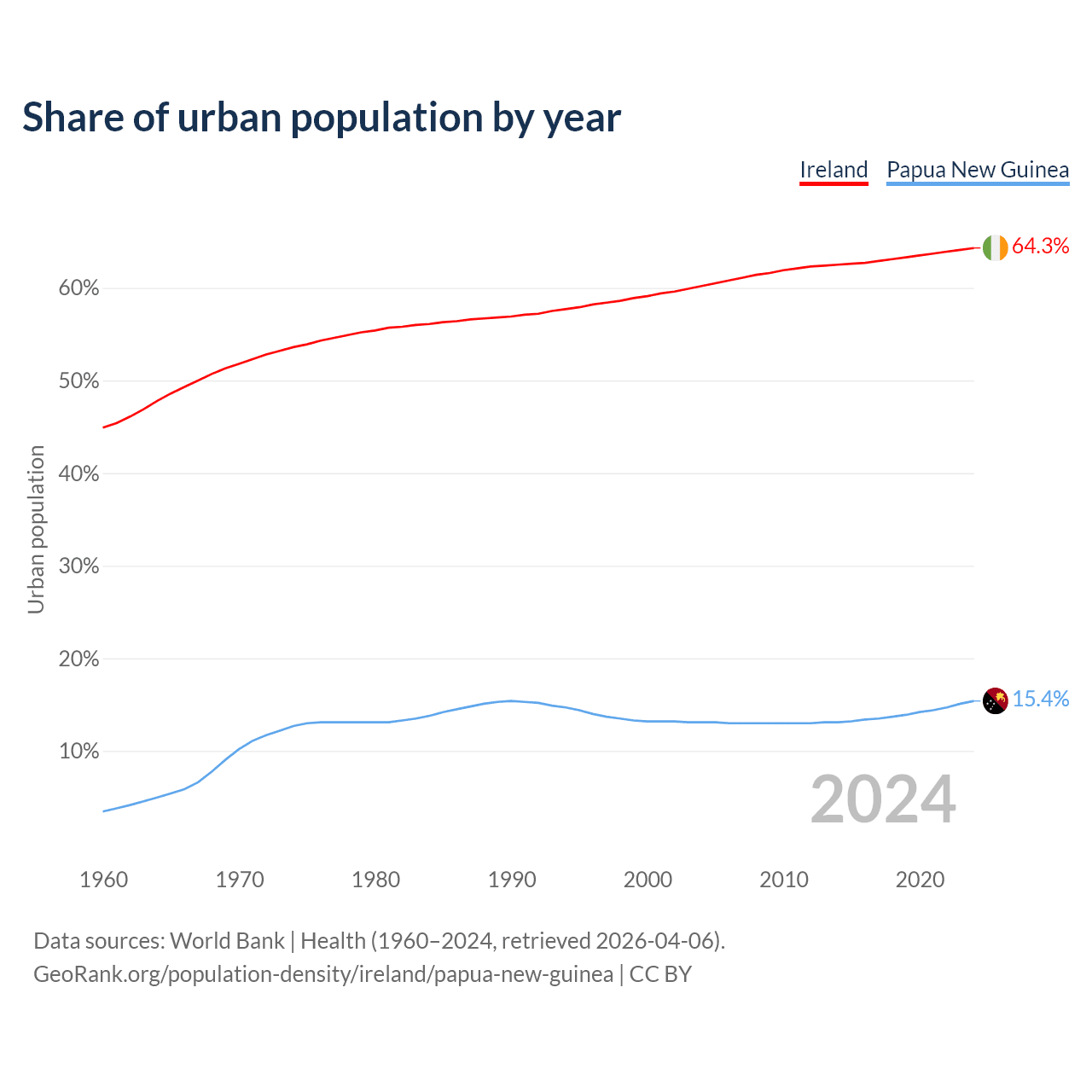 From 2004 to 2024, the share of urban population changed from 60.2% to 64.3% in Ireland and from 13.1% to 15.4% in Papua New Guinea.