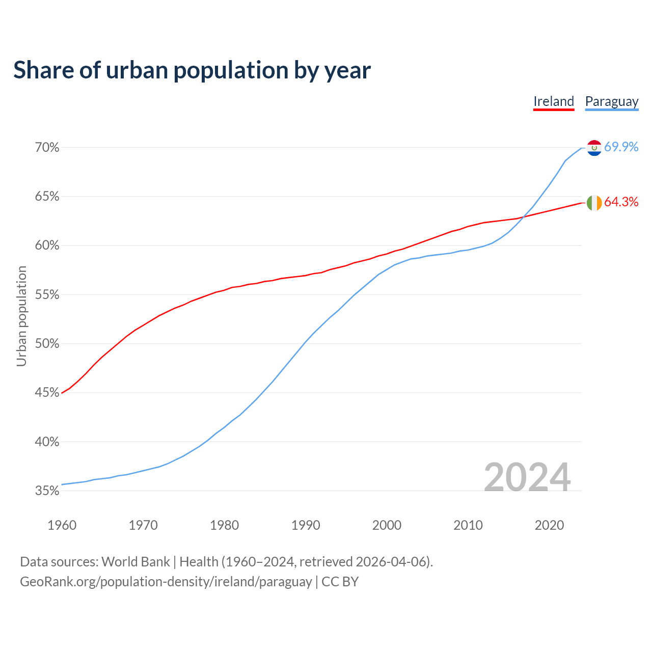 From 2004 to 2024, the share of urban population changed from 60.2% to 64.3% in Ireland and from 58.7% to 69.9% in Paraguay.