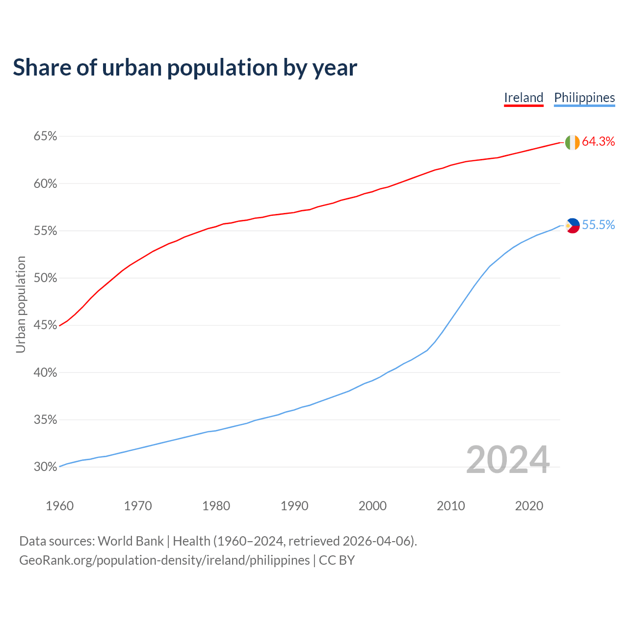 From 2004 to 2024, the share of urban population changed from 60.2% to 64.3% in Ireland and from 40.9% to 55.5% in the Philippines.