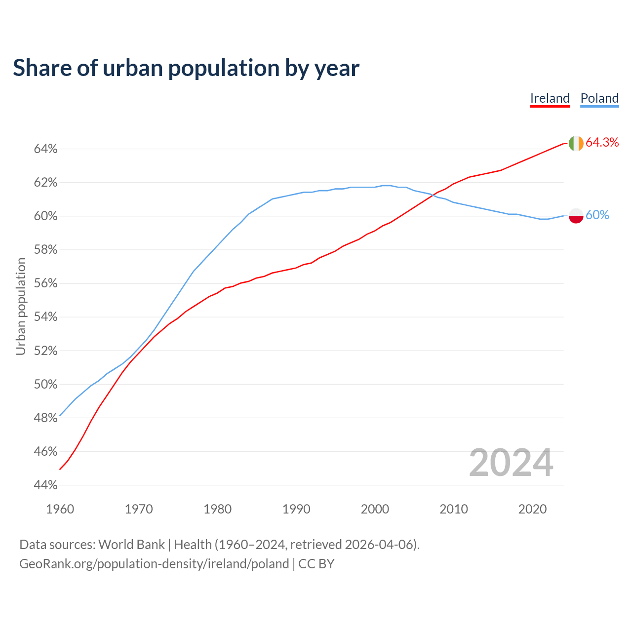 From 2004 to 2024, the share of urban population changed from 60.2% to 64.3% in Ireland and from 61.7% to 60% in Poland.