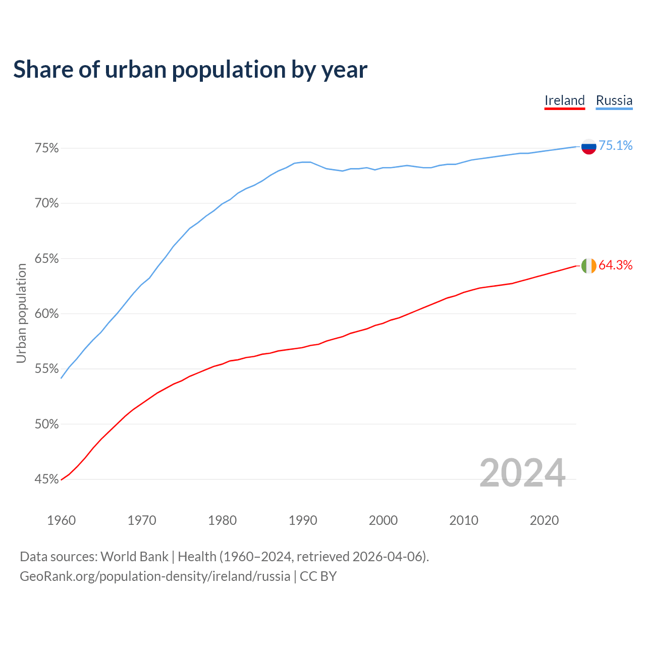 From 2004 to 2024, the share of urban population changed from 60.2% to 64.3% in Ireland and from 73.3% to 75.1% in Russia.