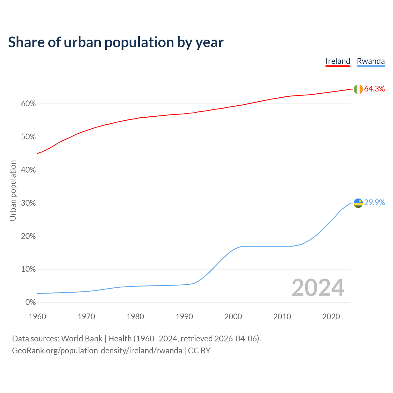 From 2004 to 2024, the share of urban population changed from 60.2% to 64.3% in Ireland and from 16.9% to 29.9% in Rwanda.