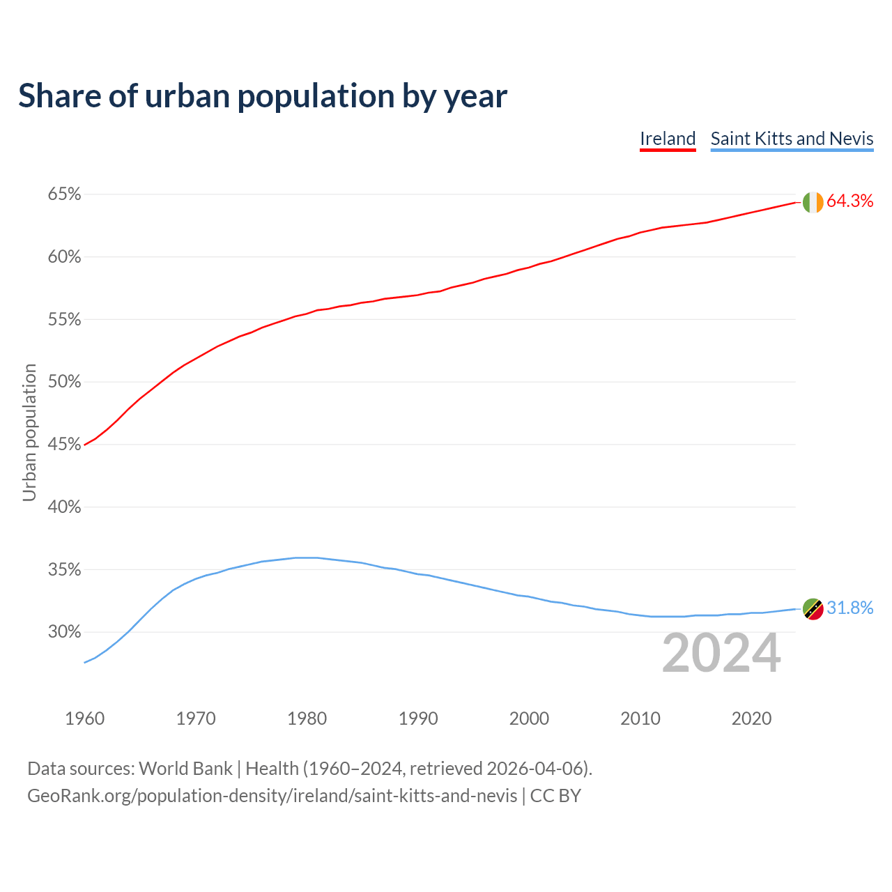 From 2004 to 2024, the share of urban population changed from 60.2% to 64.3% in Ireland and from 32.1% to 31.8% in Saint Kitts and Nevis.