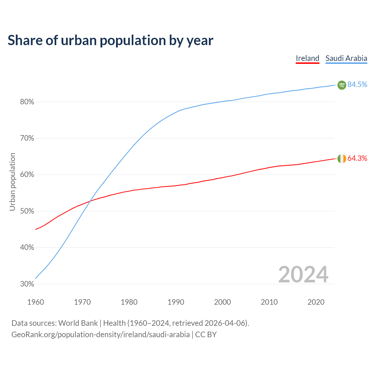 From 2004 to 2024, the share of urban population changed from 60.2% to 64.3% in Ireland and from 80.8% to 84.5% in Saudi Arabia.