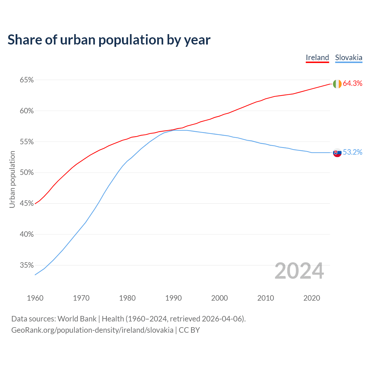 From 2004 to 2024, the share of urban population changed from 60.2% to 64.3% in Ireland and from 55.6% to 53.2% in Slovakia.