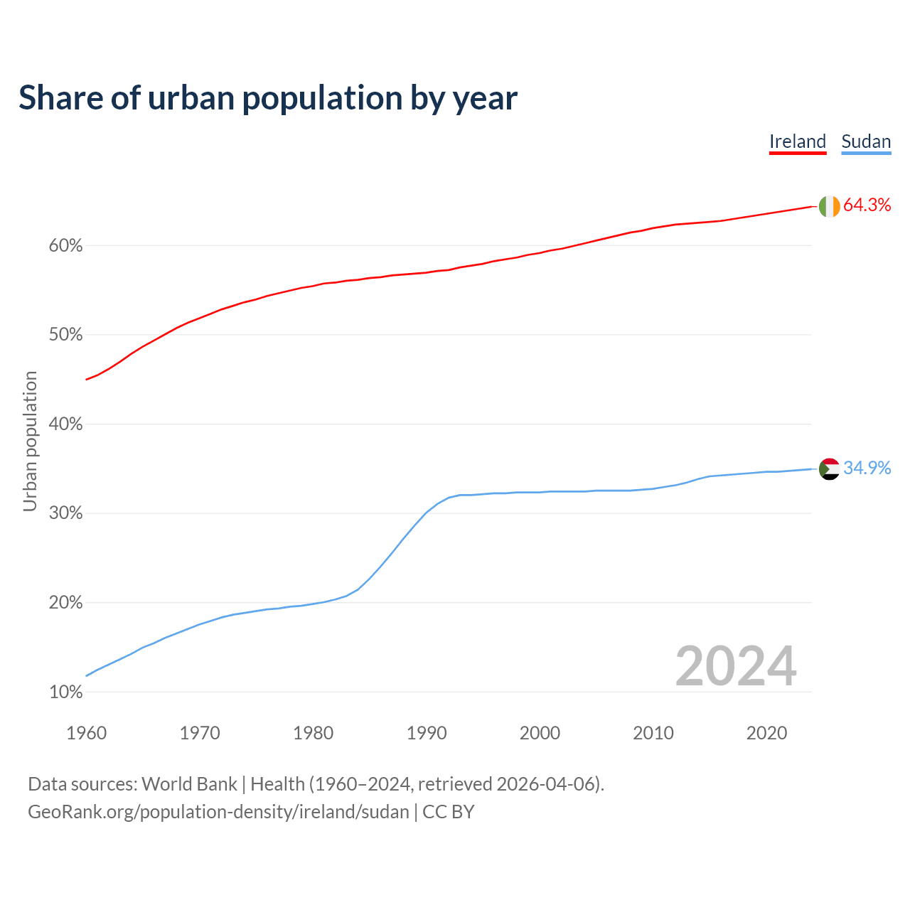 From 2004 to 2024, the share of urban population changed from 60.2% to 64.3% in Ireland and from 32.4% to 34.9% in Sudan.