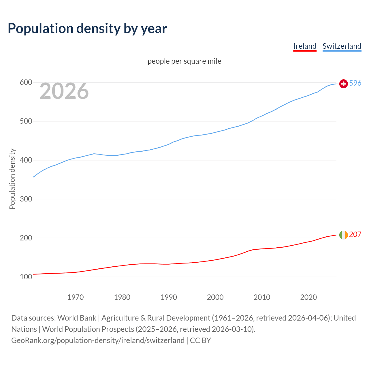 From 2006 to 2026, population density in Ireland increased by 28.8%, compared to a 21.6% growth in Switzerland.