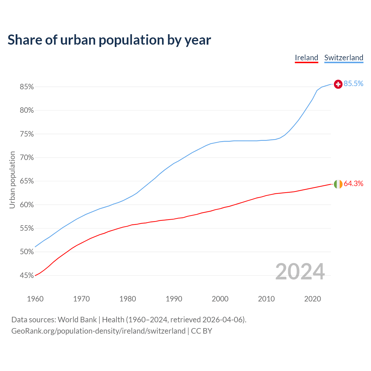 From 2004 to 2024, the share of urban population changed from 60.2% to 64.3% in Ireland and from 73.5% to 85.5% in Switzerland.
