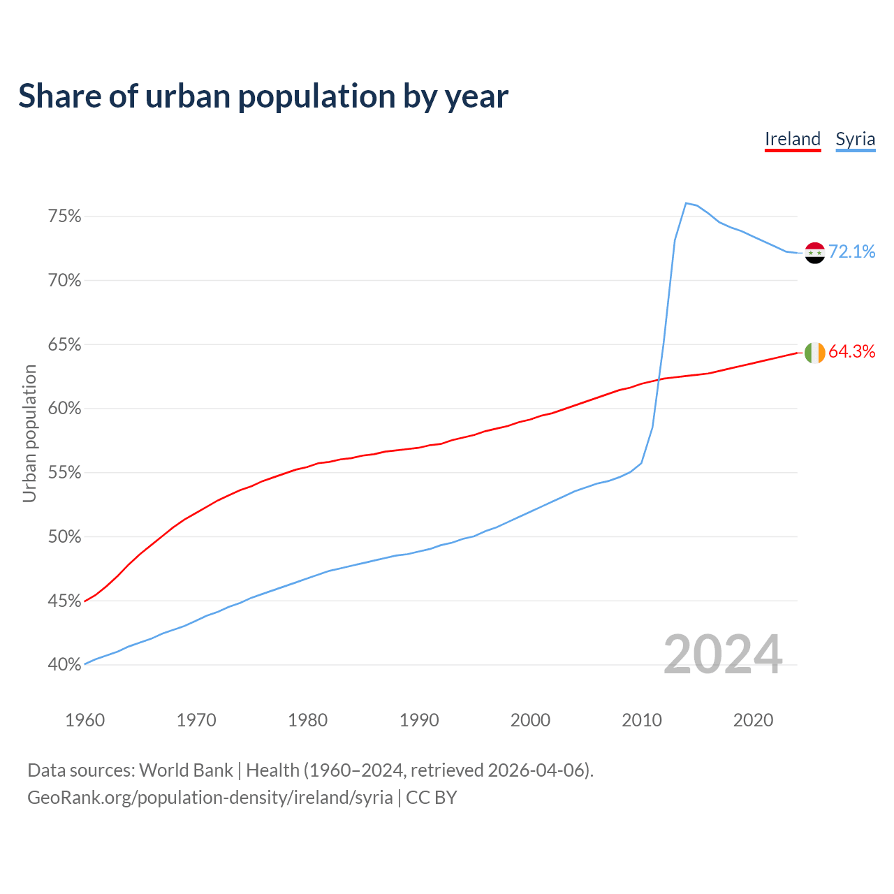 From 2004 to 2024, the share of urban population changed from 60.2% to 64.3% in Ireland and from 53.5% to 72.1% in Syria.