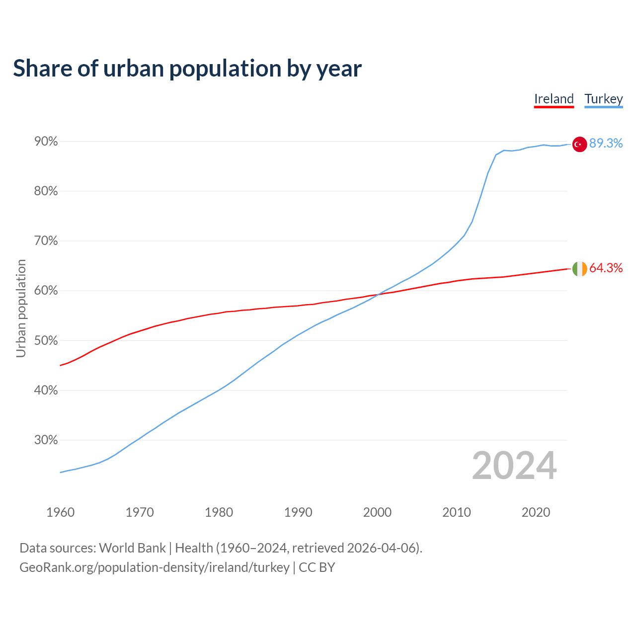From 2004 to 2024, the share of urban population changed from 60.2% to 64.3% in Ireland and from 62.4% to 89.3% in Turkey.