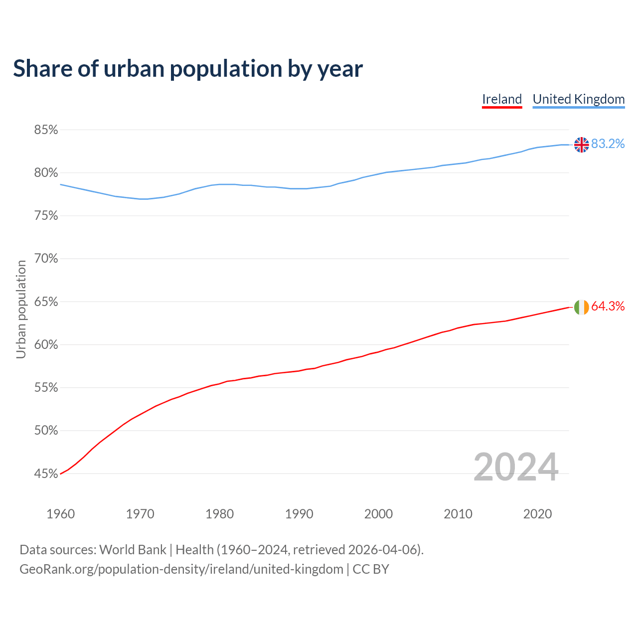 From 2004 to 2024, the share of urban population changed from 60.2% to 64.3% in Ireland and from 80.3% to 83.2% in the United Kingdom.