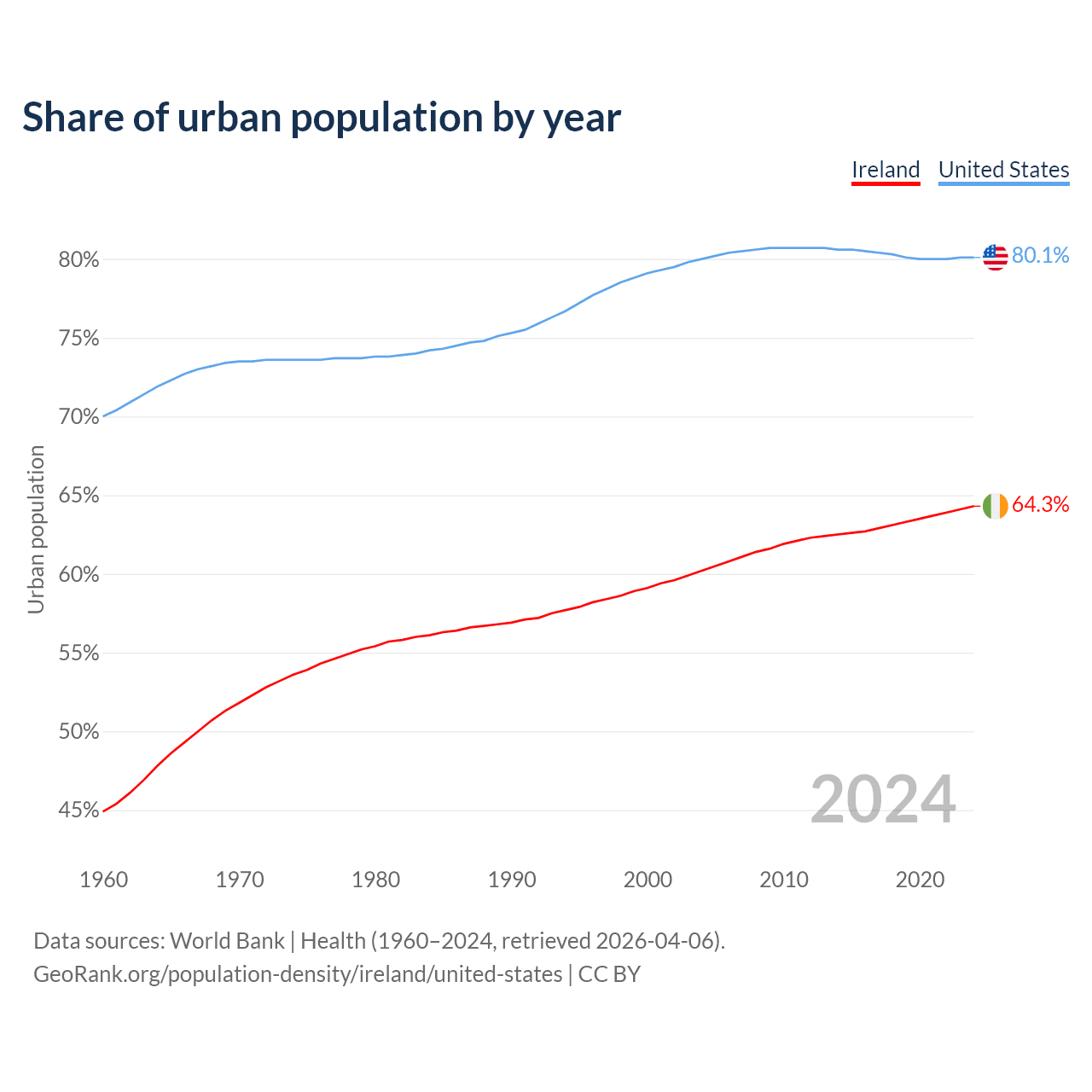 From 2004 to 2024, the share of urban population changed from 60.2% to 64.3% in Ireland and from 80% to 80.1% in the United States.