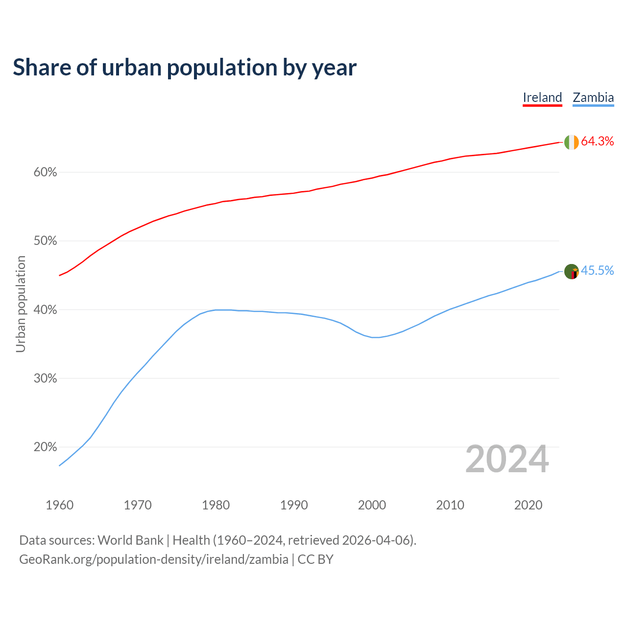 From 2004 to 2024, the share of urban population changed from 60.2% to 64.3% in Ireland and from 36.8% to 45.5% in Zambia.
