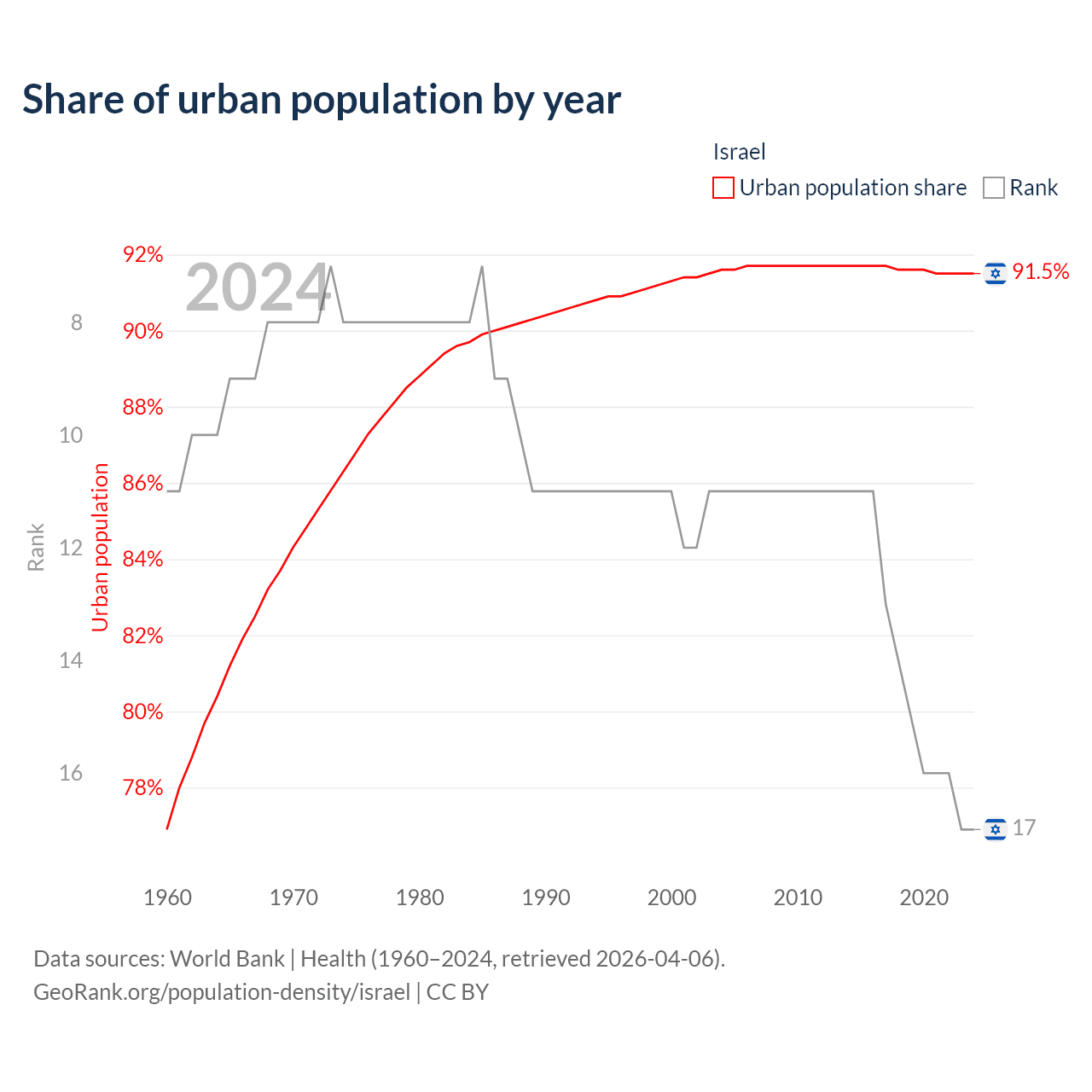 This chart shows the share of urban population in Israel from 1960 to 2024: 76.9% lived in urban areas in 1960, 91.3% in 2000, and 91.5% in 2024.