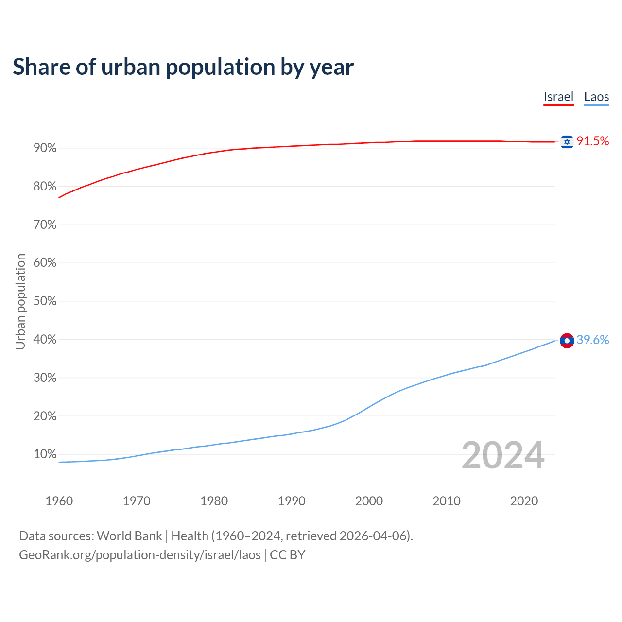 From 2004 to 2024, the share of urban population changed from 91.6% to 91.5% in Israel and from 26.5% to 39.6% in Laos.