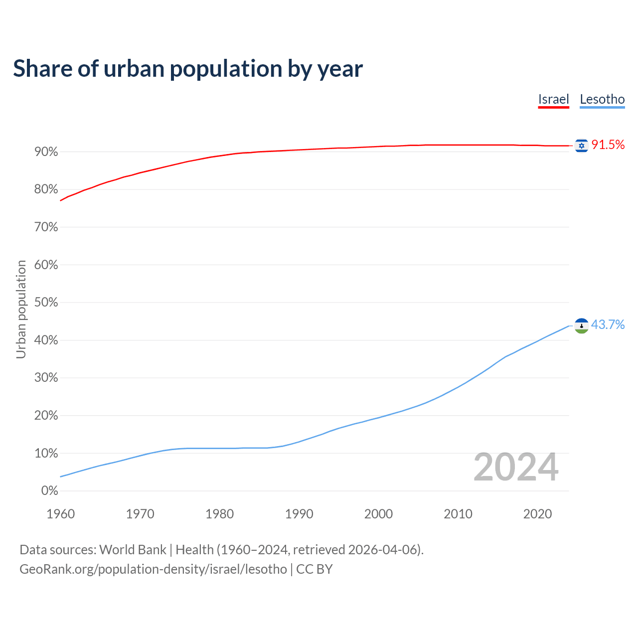 From 2004 to 2024, the share of urban population changed from 91.6% to 91.5% in Israel and from 21.8% to 43.7% in Lesotho.