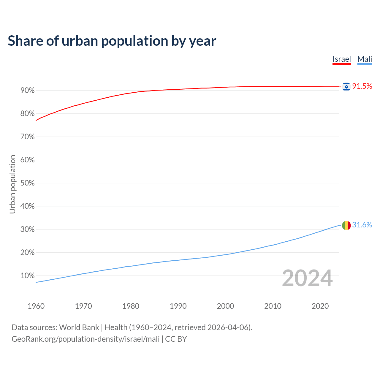 From 2004 to 2024, the share of urban population changed from 91.6% to 91.5% in Israel and from 20.5% to 31.6% in Mali.