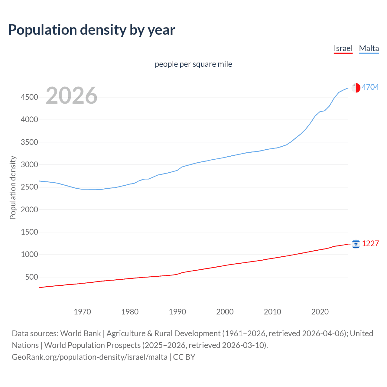 From 2006 to 2026, population density in Israel increased by 45.4%, compared to a 43.4% growth in Malta.