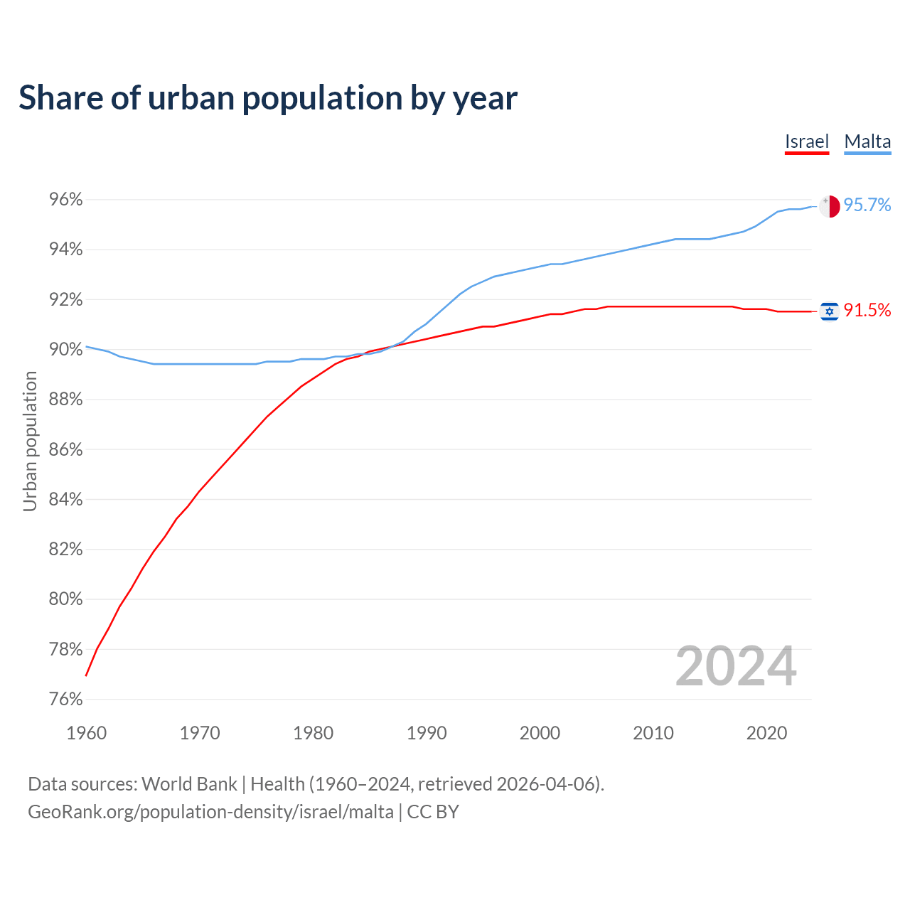 From 2004 to 2024, the share of urban population changed from 91.6% to 91.5% in Israel and from 93.6% to 95.7% in Malta.