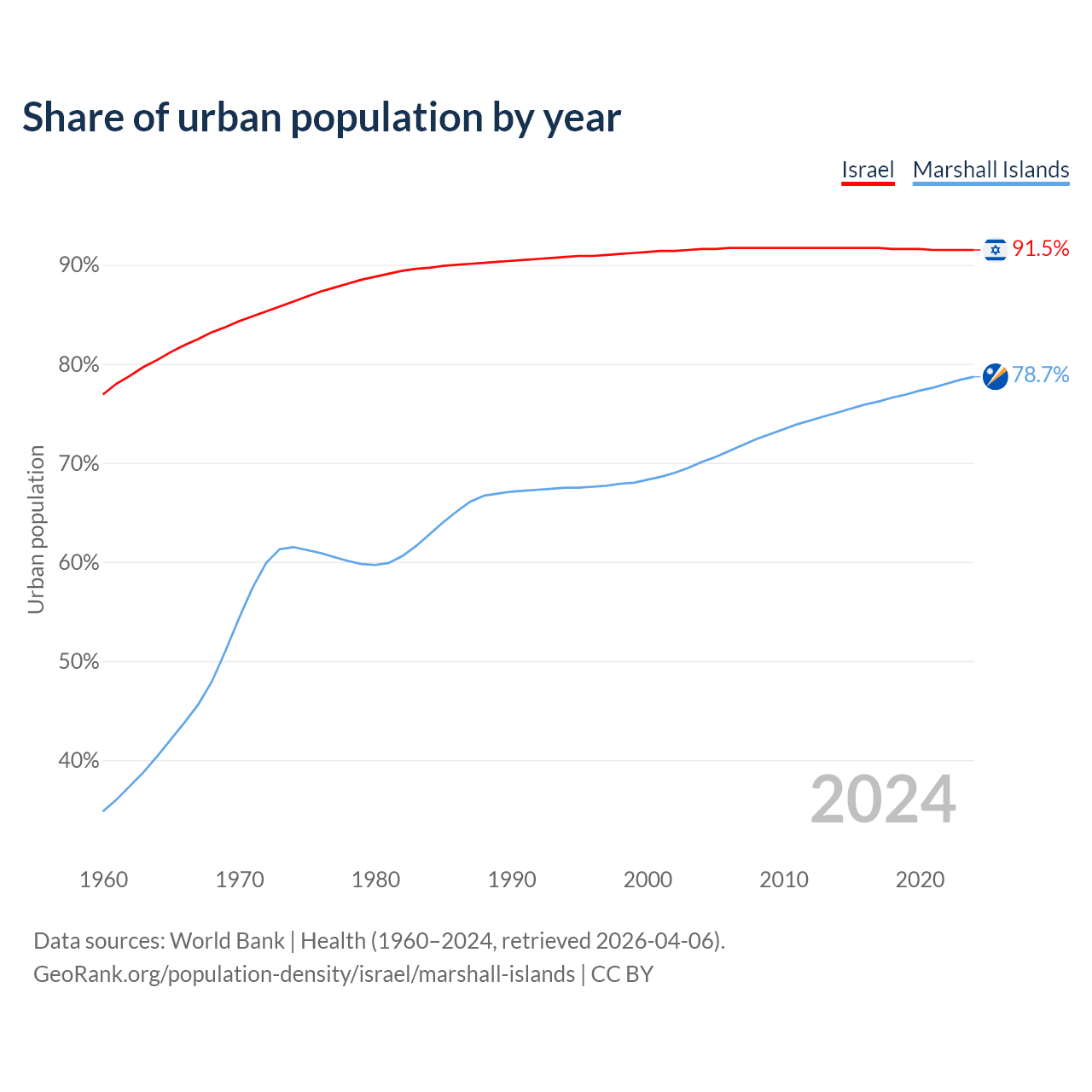 From 2004 to 2024, the share of urban population changed from 91.6% to 91.5% in Israel and from 70.1% to 78.7% in the Marshall Islands.
