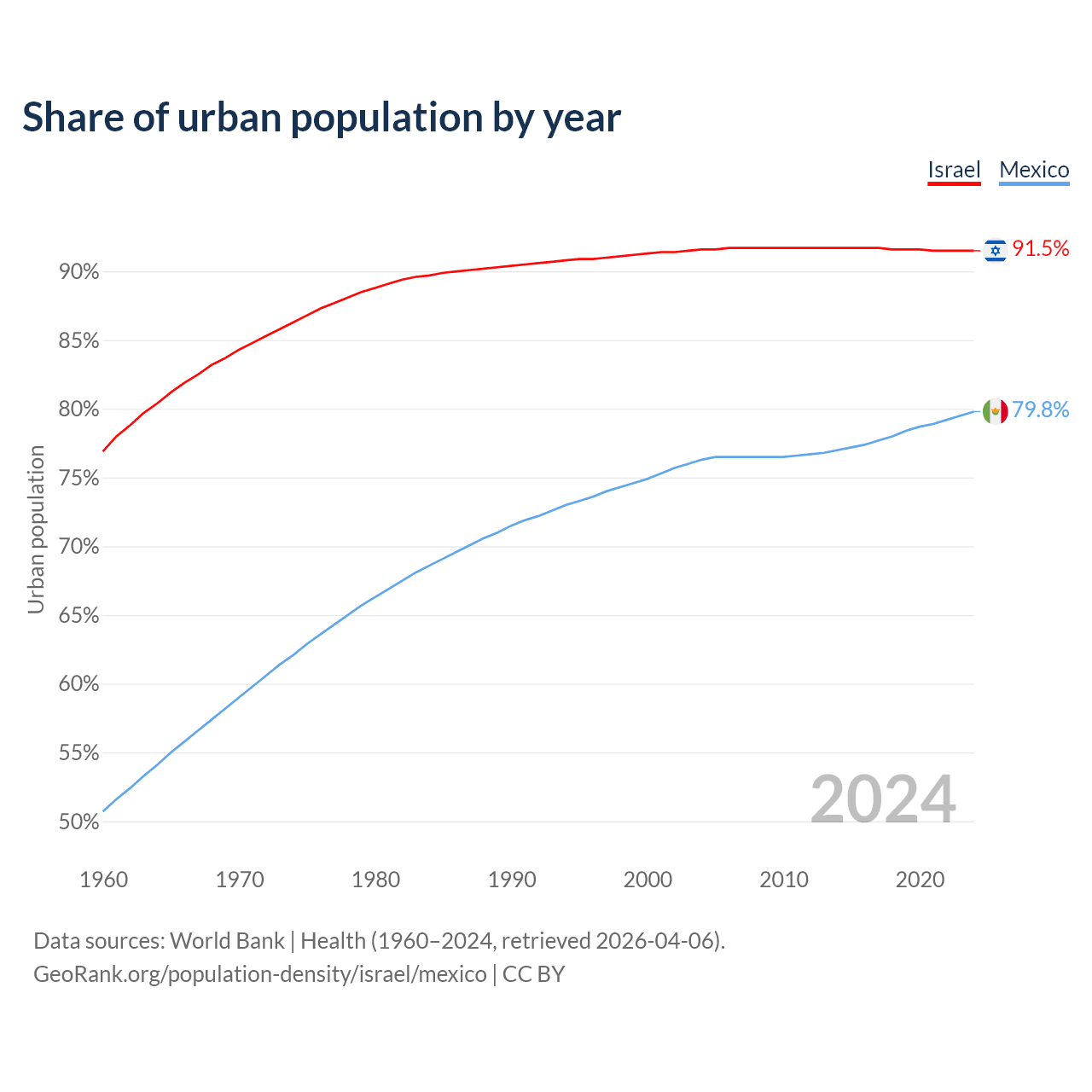 From 2004 to 2024, the share of urban population changed from 91.6% to 91.5% in Israel and from 76.3% to 79.8% in Mexico.