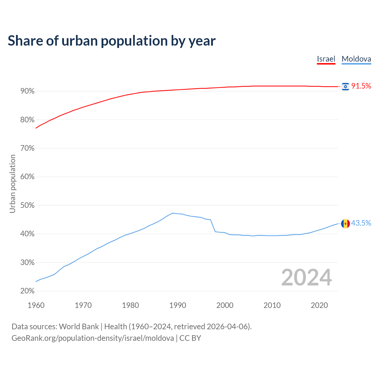 From 2004 to 2024, the share of urban population changed from 91.6% to 91.5% in Israel and from 39.4% to 43.5% in Moldova.