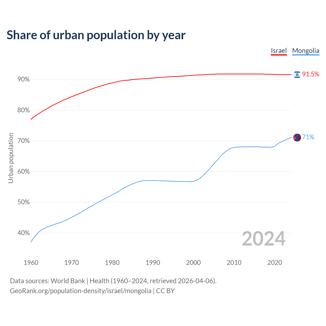 From 2004 to 2024, the share of urban population changed from 91.6% to 91.5% in Israel and from 60.8% to 71% in Mongolia.