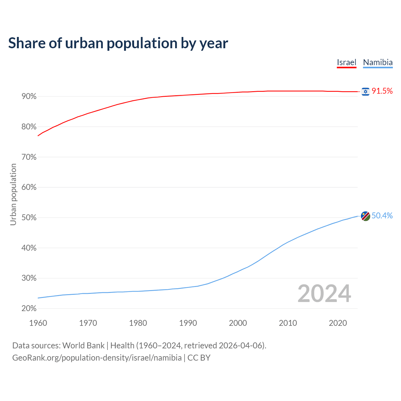 From 2004 to 2024, the share of urban population changed from 91.6% to 91.5% in Israel and from 35.5% to 50.4% in Namibia.