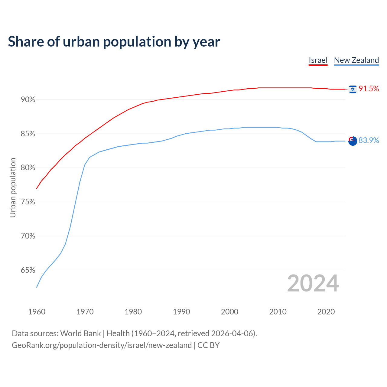 From 2004 to 2024, the share of urban population changed from 91.6% to 91.5% in Israel and from 85.9% to 83.9% in New Zealand.
