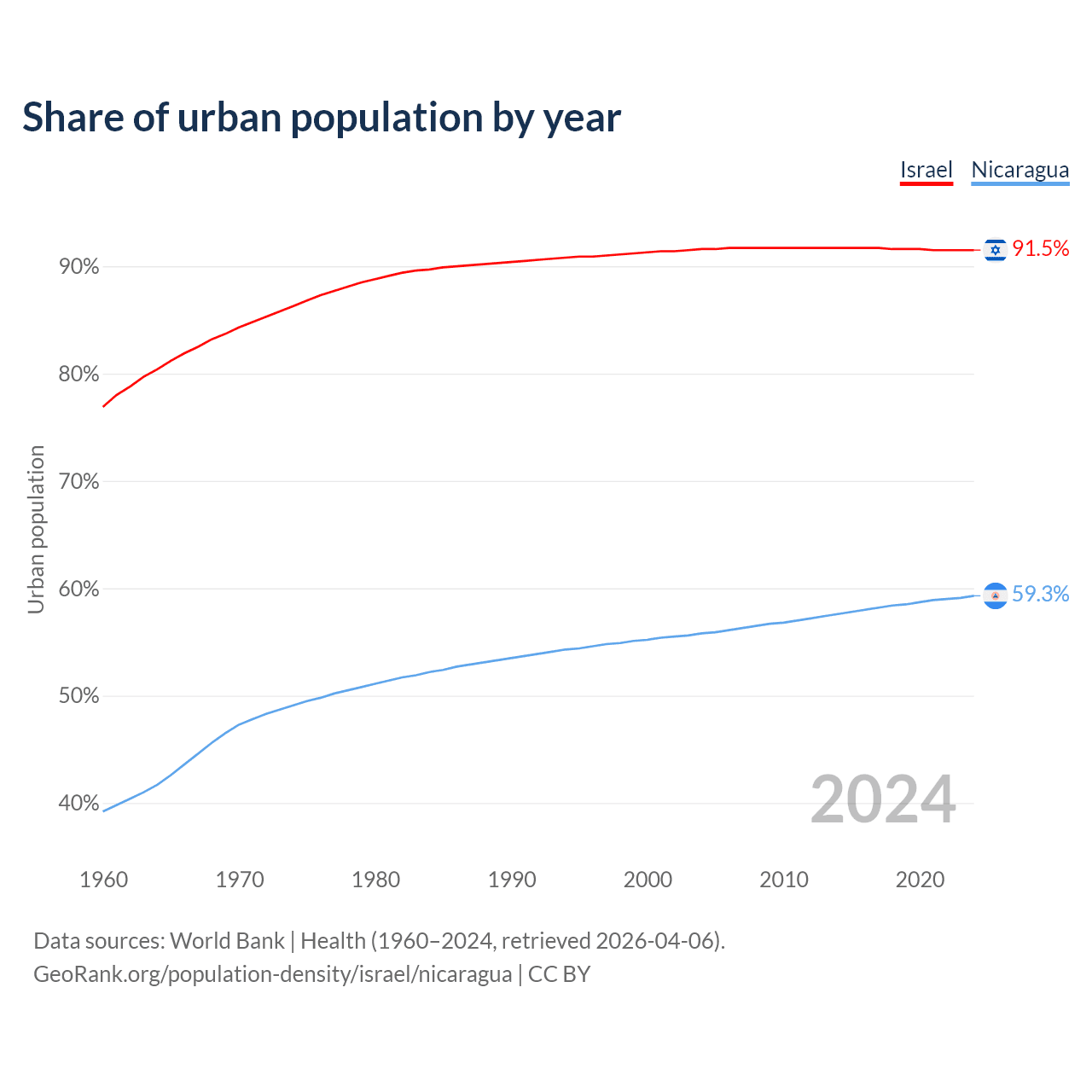 From 2004 to 2024, the share of urban population changed from 91.6% to 91.5% in Israel and from 55.8% to 59.3% in Nicaragua.