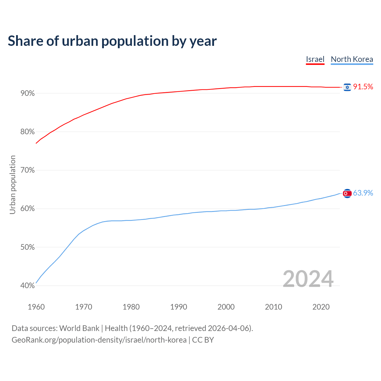 From 2004 to 2024, the share of urban population changed from 91.6% to 91.5% in Israel and from 59.7% to 63.9% in North Korea.