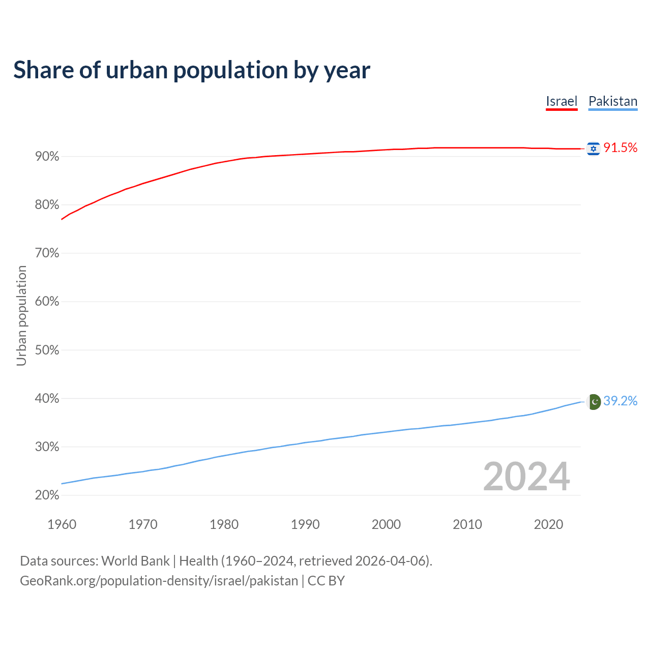 From 2004 to 2024, the share of urban population changed from 91.6% to 91.5% in Israel and from 33.7% to 39.2% in Pakistan.