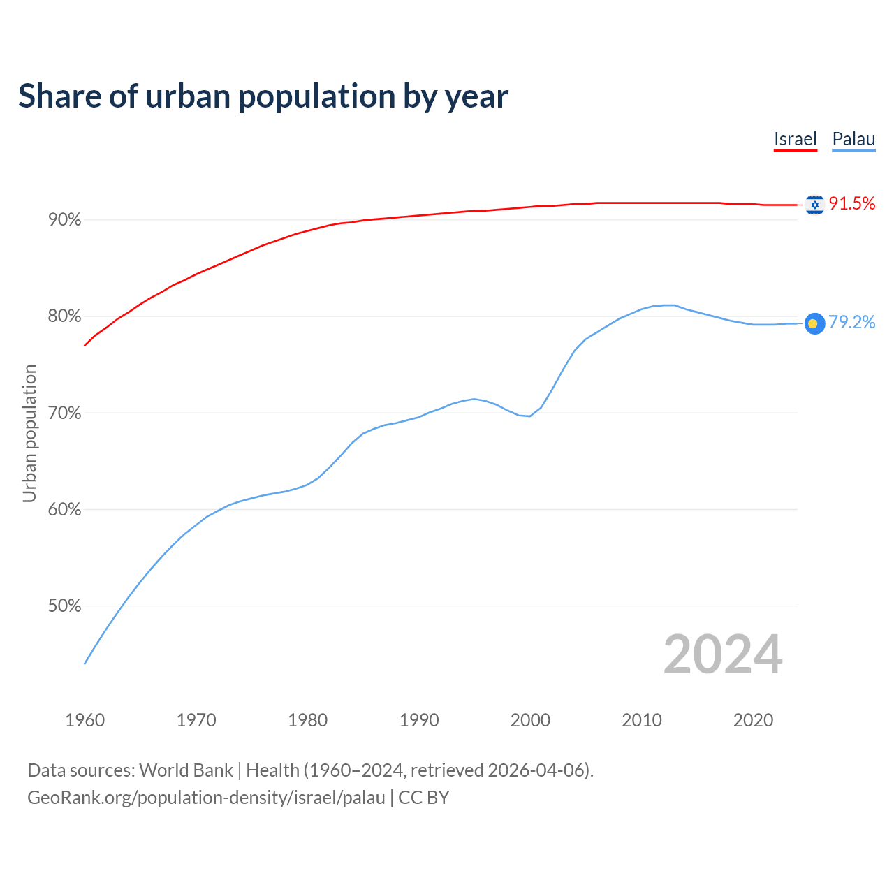 From 2004 to 2024, the share of urban population changed from 91.6% to 91.5% in Israel and from 76.4% to 79.2% in Palau.