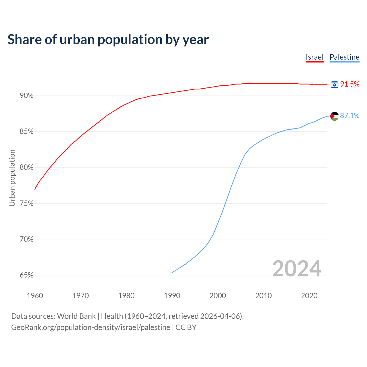From 2004 to 2024, the share of urban population changed from 91.6% to 91.5% in Israel and from 79% to 87.1% in Palestine.