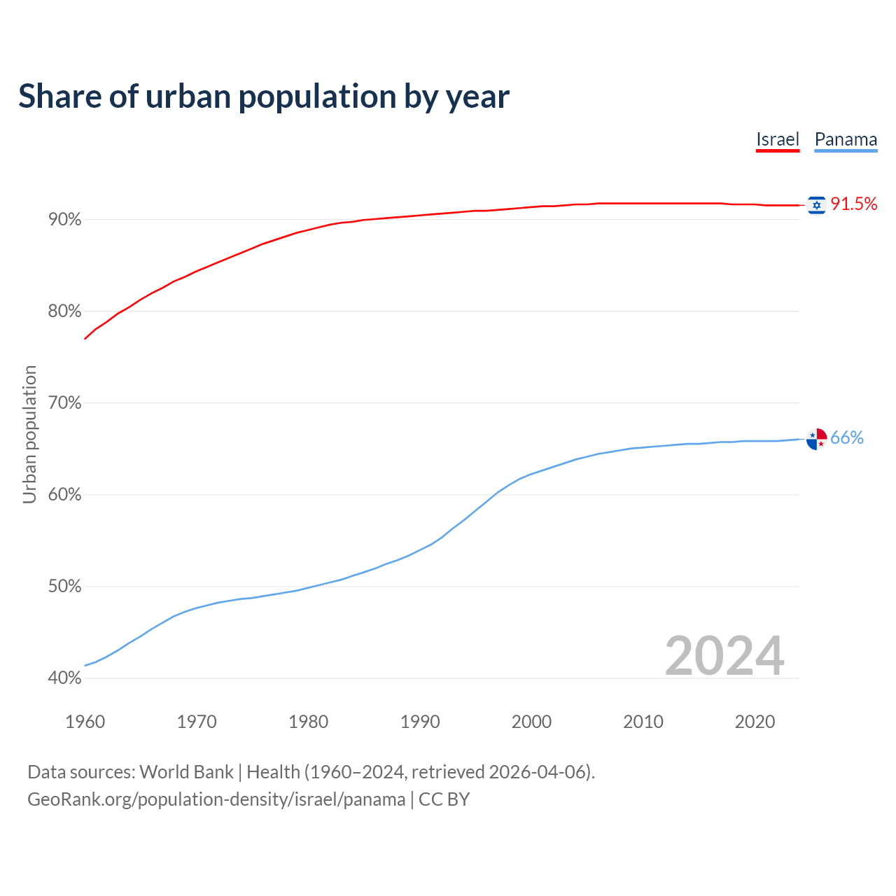 From 2004 to 2024, the share of urban population changed from 91.6% to 91.5% in Israel and from 63.8% to 66% in Panama.