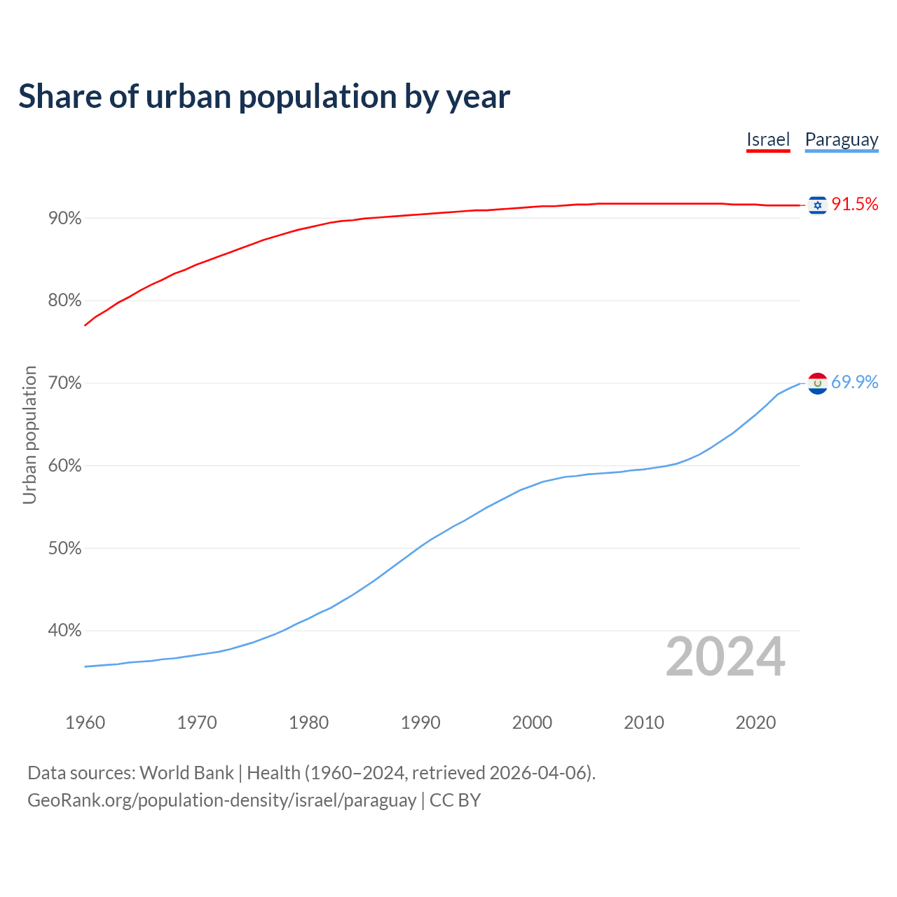 From 2004 to 2024, the share of urban population changed from 91.6% to 91.5% in Israel and from 58.7% to 69.9% in Paraguay.