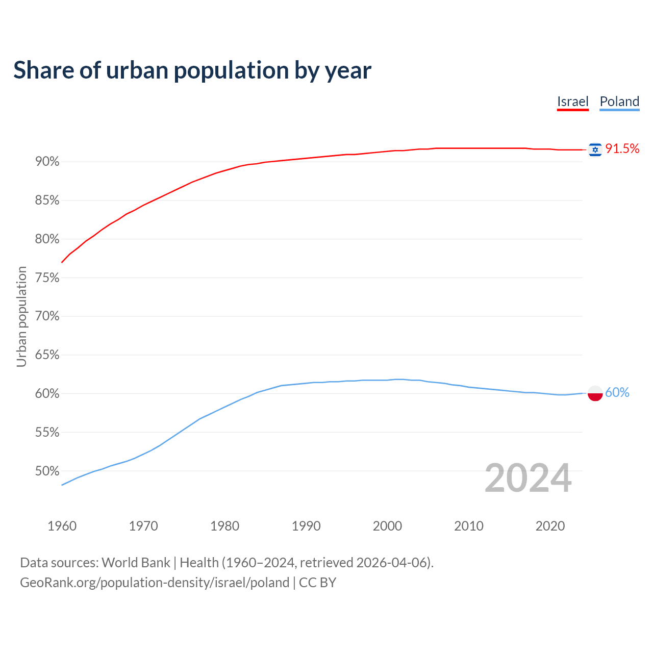 From 2004 to 2024, the share of urban population changed from 91.6% to 91.5% in Israel and from 61.7% to 60% in Poland.