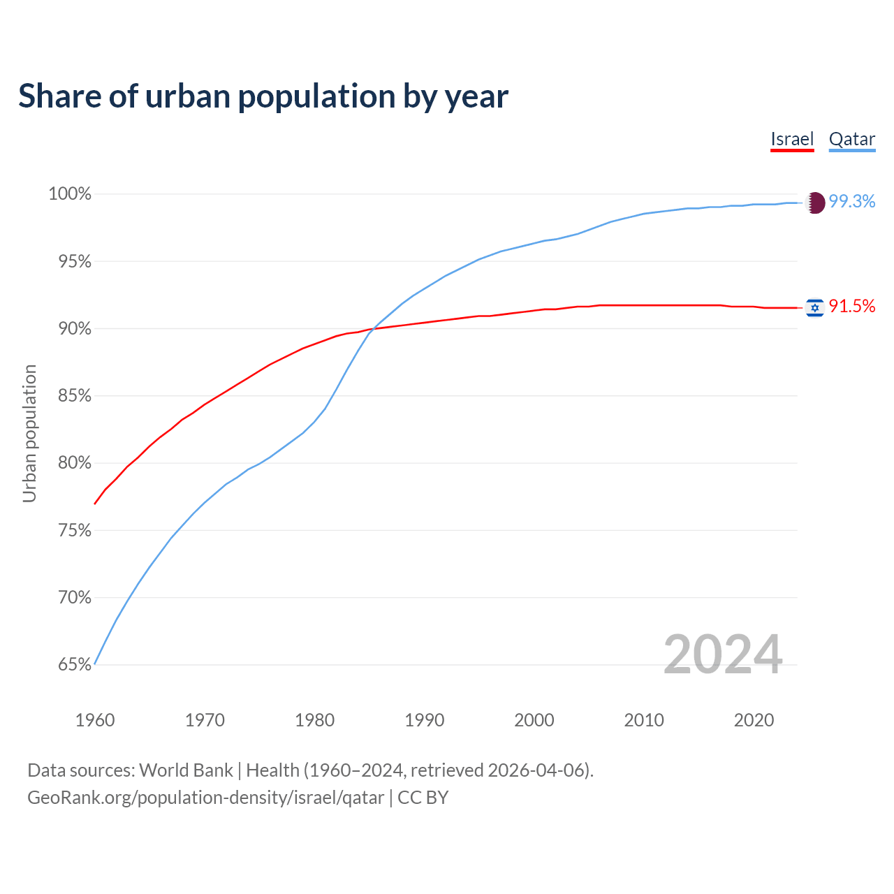 From 2004 to 2024, the share of urban population changed from 91.6% to 91.5% in Israel and from 97% to 99.3% in Qatar.